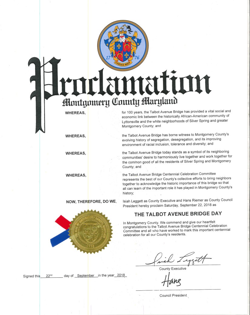 Montgomery County Executive Isiah Leggett presented the Talbot Avenue Bridge Centennial Celebration Committee with a proclamation declaring September 22, 2018 “Talbot Avenue Bridge Day.”